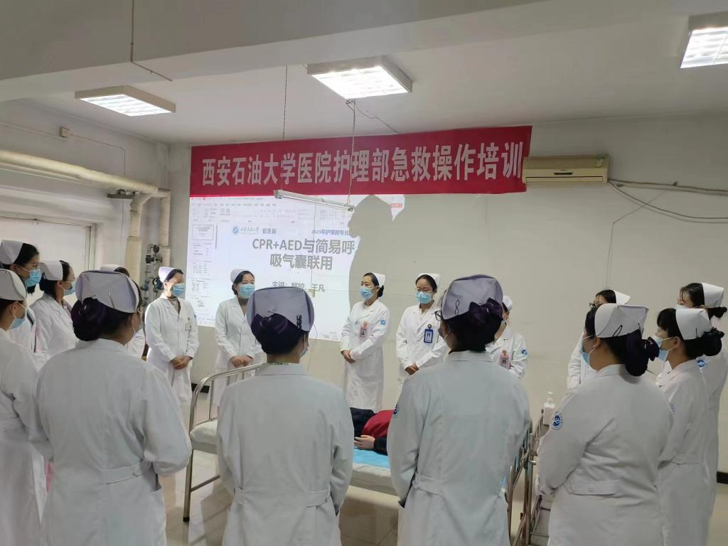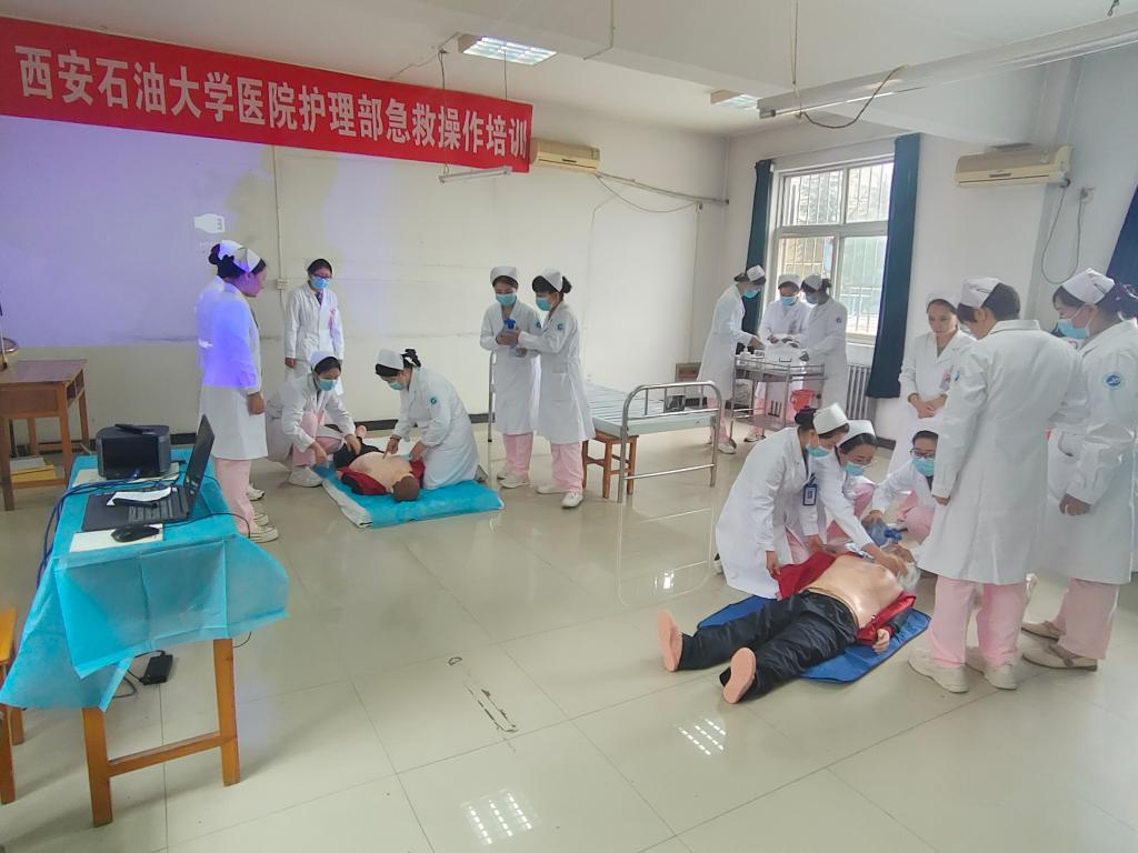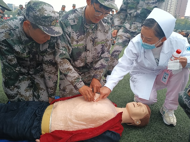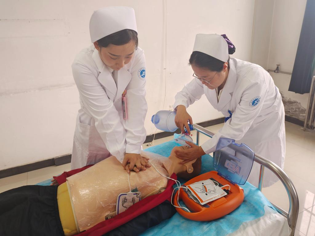 本次模拟演练活动分为心肺复苏术(CPR)及自动体外除颤仪(AED)使用两个环节。活动现场,在鄠邑区红十字会工作人员理论知识讲解和引导下,校医院12名医护人员以连为单位现场通过模拟观察险情、问询、呼救、处理口腔和气道、胸部按压、人工呼吸等对“模拟人”进行了心肺复苏操作全过程演示。
