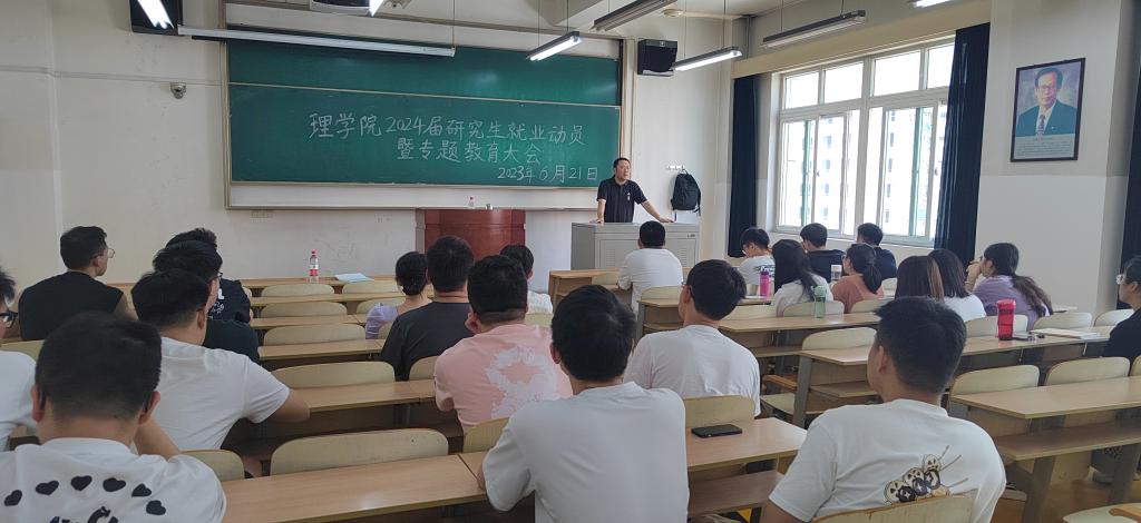 2024届研究生就业工作,折延宏副院长分三个方面作就业动员。一是希望研究生同学早思考、早准备,将就业与考博作为下一阶段最重要工作;二是希望研究生同学立足所学专业,将目光放长远,到基层去、到祖国需要的地方建功立业;三是希望研究生同学关注本年度暑期社会实践、企业就业实习,为成功求职打下坚实基础。最后,折老师结合暑假实验室安全、“端午”小长假,为大家作了安全教育和提示。