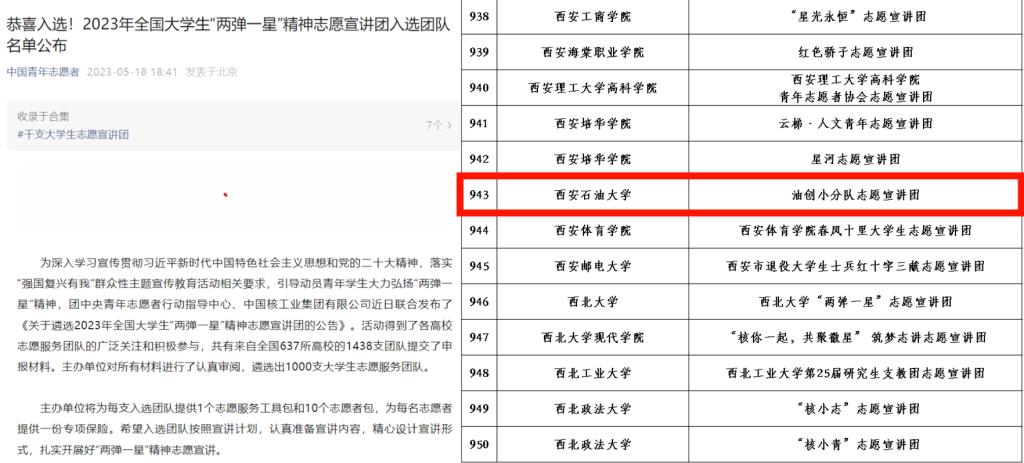 同时,为深入学习贯彻习近平新时代中国特色社会主义思想和党的二十大精神,落实“强国复兴有我”群众性主题宣传教育活动的相关要求,引导动员青年学生大力弘扬“两弹一星”精神,团中央青年志愿者行动指导中心、中国核工业集团有限公司近日联合发布了《关于遴选2023年全国大学生“两弹一星”精神志愿宣讲团的公告》。活动得到了各高校志愿服务团队的广泛关注和积极参与,共有来自全国637所高校的1438支团队提交了申报材料。主办单位对所有材料进行了认真审阅,遴选出1000支大学生志愿服务团队,德州扑克