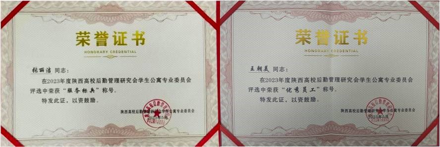 后勤处楼宇管理服务中心荣获“陕西高校学生公寓先进集体”荣誉称号,楼宇管理服务中心张丽洁、王朝美同志分别荣获陕西高校学生公寓服务标兵和优秀员工荣誉称号。同时,由楼宇管理服务中心撰写的“不忘初心担使命,立足本职护校园”在公寓专业委员会三十周年主题征文活动中获得特等奖。