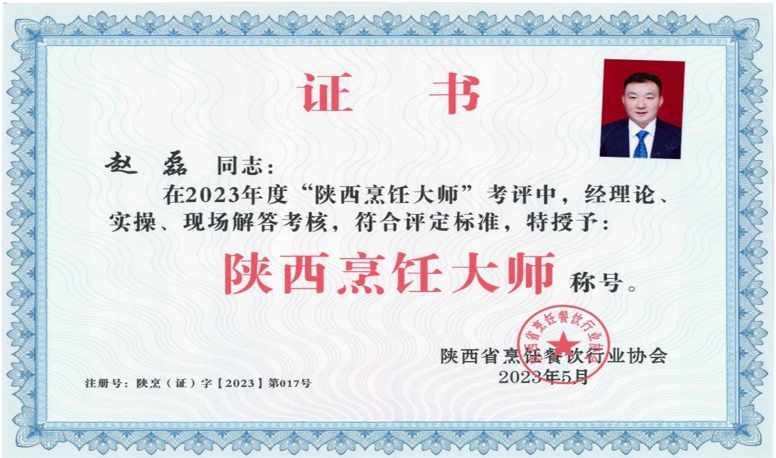 鄠邑校区项目部经理赵磊同志荣获“陕西烹饪大师”称号。