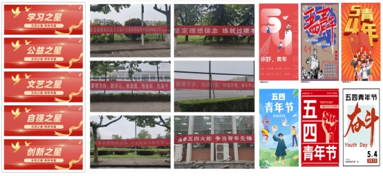 学习之星、自强之星、创新之星、公益之星、文艺之星获奖者风采。三是集思广益,发挥学生聪明才智,鼓励学生参与设计制作“五四”系列海报、横幅并进行展示宣传,营造了浓厚的节日氛围。