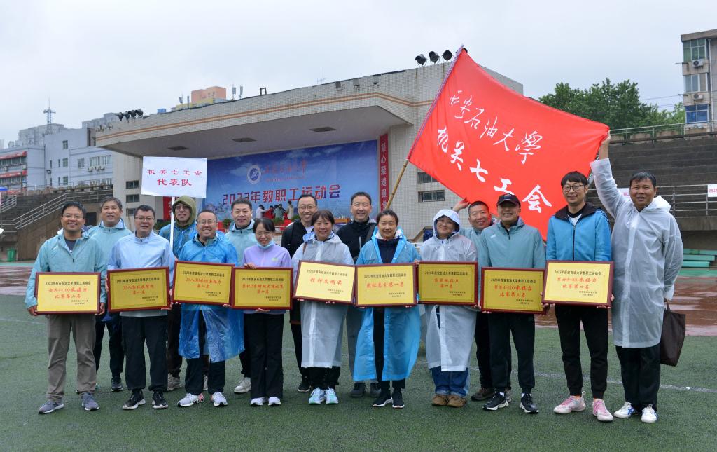 2023年教职工运动会在雁塔校区田径场举行。由后勤处职工组成的机关七工会代表队迎风冒雨,团结协作、并肩战斗、奋勇拼搏。这只运动员平均年龄达48岁多的代表队,一共参加了7项集体、23项个人比赛项目,参加人员为39人次。为期一天的赛事活动中,大家在赛场上热情洋溢,挥洒汗水,留下了一个个拼搏进取的矫健身影、一幅幅精彩绝伦的竞技画面。