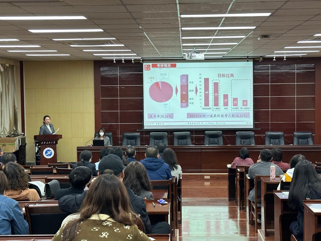 关于表彰2022届毕业生就业工作先进个人的决定》,余小勇、李涛、方松林为获奖教师颁发荣誉证书。随后,盛丹就2023届毕业生基本情况、就业进度、考研报名及初试情况汇报了2023届毕业生就业工作进展。她指出,目前2023届毕业生就业形势依然十分严峻,不容乐观。她向全体教职工汇报了已开展工作、目前面临的难点和下一步计划,强调毕业生就业工作需要全院教师共同参与,形成合力,要千方百计教育毕业生树立正确就业观、择业观,想方设法推进学生想就业、能就业、快就业。