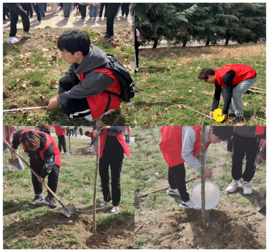 鄠邑校区环道东侧区域。活动过程中,志愿者在后勤处工作人员的指导下,身穿志愿红马甲,精心完成从放树、剪枝、填土、踩实到浇水的每一个步骤,相互分工合作、配合默契,整个植树活动现场一片热火朝天的劳动景象。