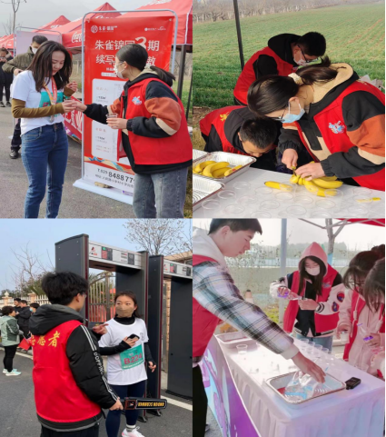 集合完毕前往服务点,参与赛事的秩序维护、起点安检、赛前检录、起跑准备、选手存包、赛点物资补给等志愿服务工作。