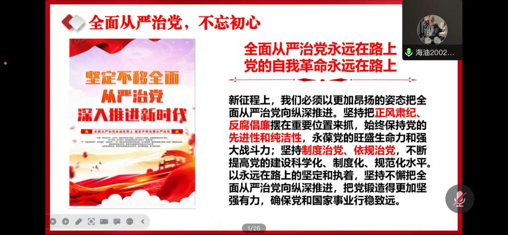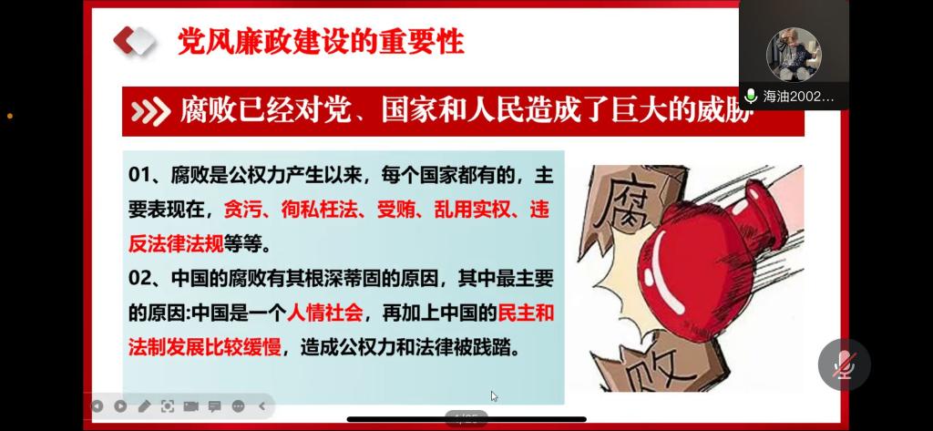 梁美玉:本次活动不管是视频中党对腐败分子的绝不姑息还是同学们对党内腐败现象的义愤填膺,都让我意识到全面从严治党是马克思主义政党的鲜明品格,是百年大党风华正茂的奥秘所在,是实现中华民族伟大复兴的根本保证。