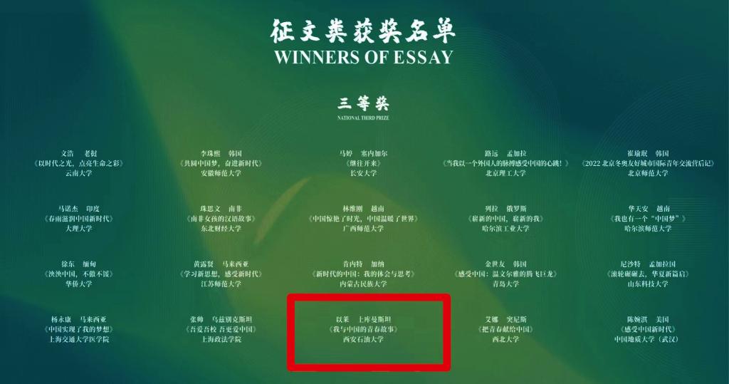 土库曼斯坦籍留学生以莱的作品《我与中国的青春故事》荣获征文类全国三等奖。