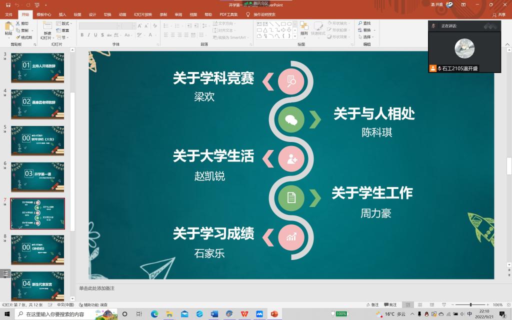 活动第二项为朋辈教育,由各位优秀学长学姐代表分享成绩、大学学习工作、大学生活、与人相处、学科竞赛方面的经验。石家乐学长提到学习仍是大学的重点,大学的课程多,科目难,要学会及时适应大学的学习特点,学会转变学习方式,才能在大学生活中取得良好的成绩。周力豪学长说到平时积极参加学生工作不仅能丰富课余生活,更能在学生工作中得到意想不到的锻炼。赵凯悦学长平时积极参加各种课余活动,对大学生活具有自己独特的见解。陈科琪学长分享到与人相处,要将心比心,既要顾及自己也要考虑他人。梁欢学长说学科竞赛是课余生活中极其有趣的一部分,关心并积极参加竞赛,能够有效地锻炼自身专业素养和综合能力。