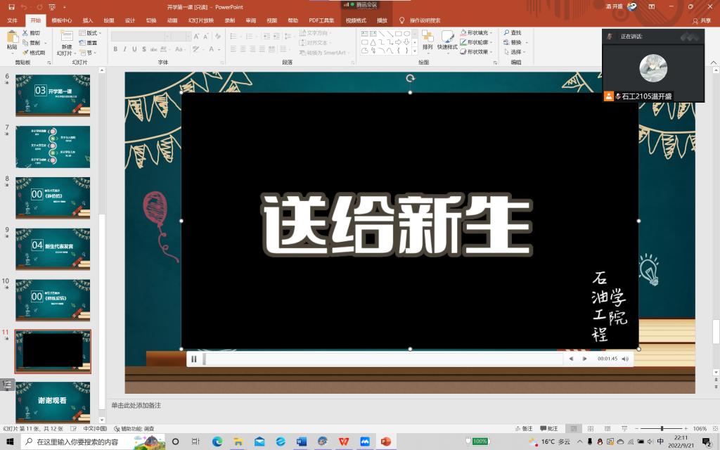 活动第三项由新生代表发言。石工2205班张宇涵表示将努力学习专业知识,积极参加课余活动,锻炼综合素养,努力将青春融入到党和国家的事业中来。