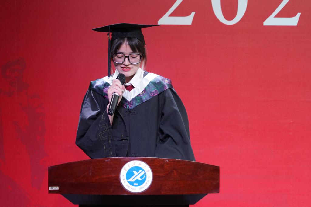 全体本科毕业生们向多年来给予辛勤教诲的各位老师致以衷心的感谢和崇高的敬意。随后,她回首四年求学时光珍贵瞬间,从军训、文艺晚会、竞赛活动到一场难忘的考试,那些与老师们、同学们相处的点点滴滴将是温暖未来岁月的宝贵财富。最后,她表示,作为一名新时代的青年,将永远不忘母校的辛勤栽培,要以实现中华民族伟大复兴为己任,增强做中国人的志气、骨气、底气,不负时代,不负韶华,不负党和人民的殷切期望。