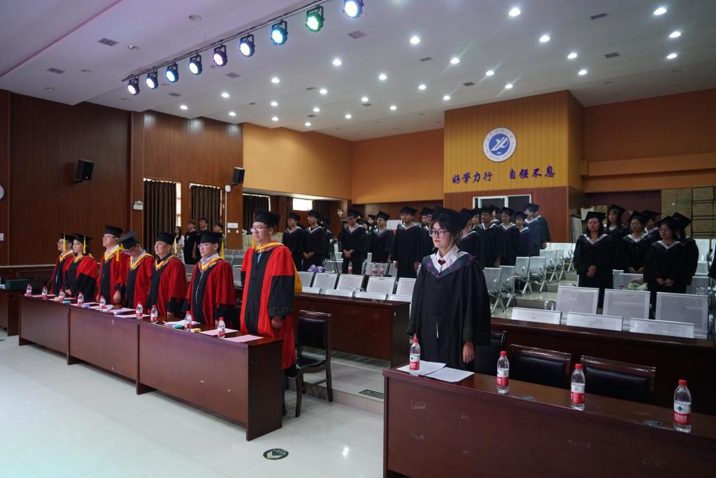 教授委员会主任、院长傅海威教授为毕业生正冠拨苏、颁发学位证并合影留念。学士学位授予仪式在雄壮的校歌声中结束。
