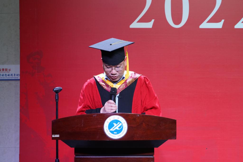 对2022届全体本科毕业生顺利获得学位表示热烈祝贺,他与同学们一起回顾了大学四年的珍贵时光。并深情寄语同学们:一要牢记青年使命,勇担国家、民族伟大复兴重任;二要坚定理想信念,求真学问,练真本领;三要明辨是非曲直,抵制诱惑,坚守底线;四要踏实做人,认真做事,知行合一;五要善待自己,接纳自己,常怀感恩之心。希望同学们勿忘母校的一草一木,有空常回母校看看。