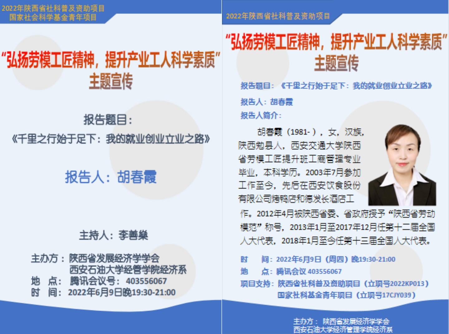 邀请第十三届全国人民代表大会代表、陕西省劳动模范胡春霞同志,以《千里之行始于足下:我的就业创业立业之路》为题,为德州扑克