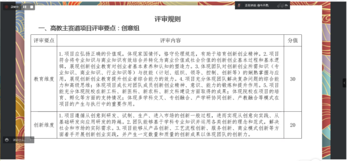 之后,刘老师从教育维度、创新维度、团队维度、商业维度、社会价值维度,公益维度、发展维度等多方面详细的讲解高教主赛道和青年红色筑梦之旅赛道的评审要点及评分细则,并深入浅出,举例说明怎样体现出“教育维度”和“带动就业”,刘老师结合自身参赛经验和评审经验,对青红旅项目存在的共性问题提出意见建议,着重强调路演PPT的专业性及重要性。