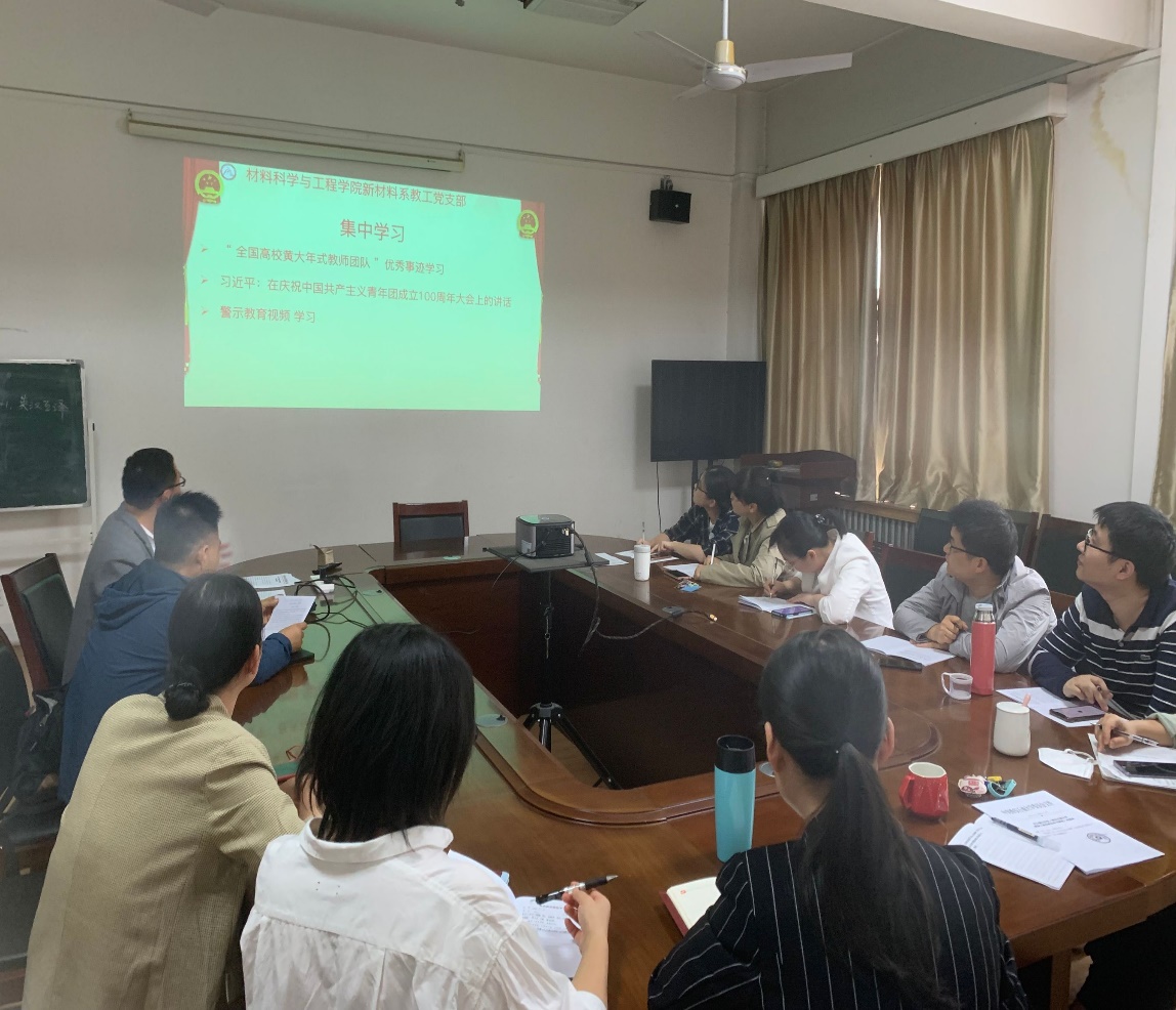 新材料系教工党支部全体党员在雁塔校区四号实验楼312会议室召开了党员大会,开展了专题学习研讨活动。深入学习陕西省“全国高校黄大年式教师团队”先进事迹,习近平总书记在庆祝中国共产主义青年团成立100周年大会上的重要讲话。会议由支部书记王磊主持,新材料系全体教师参加会议。