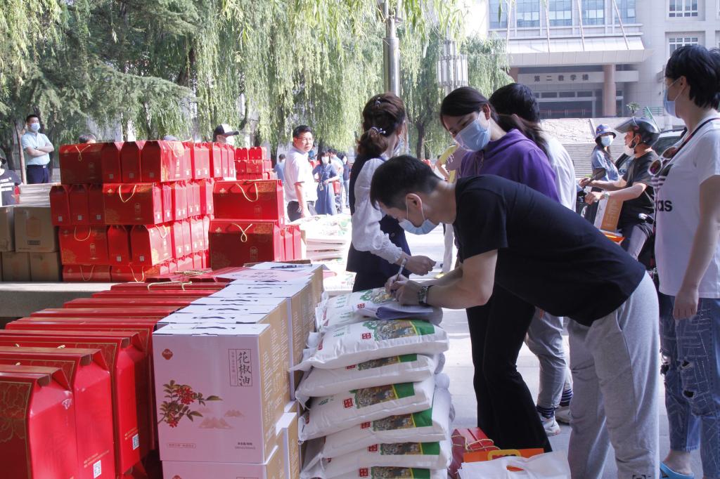 5月6日晚校工会在忠实广场把永寿县的农副产品按部门工会摆放完毕,5月7日上午由校工会组织发放,发放过程井然有序,各部门工会按照划定区域依次领取了自己的福利慰问品。工作人员认真核对每件物品,确保发放的每一件物资都要准确无误的送到每个教职工的手里。为做好此次福利发放工作,在人事处、保卫处等有关单位积极配合下,校工会全体工作人员精心筹备,对发放福利慰问品的教职员工人数、福利品种类和数量等反复核对,确保疫情防控下发放工作顺利进行,使教职工感受到参与乡村振兴的成就感和全校教职工共同努力所取得的丰富成果。