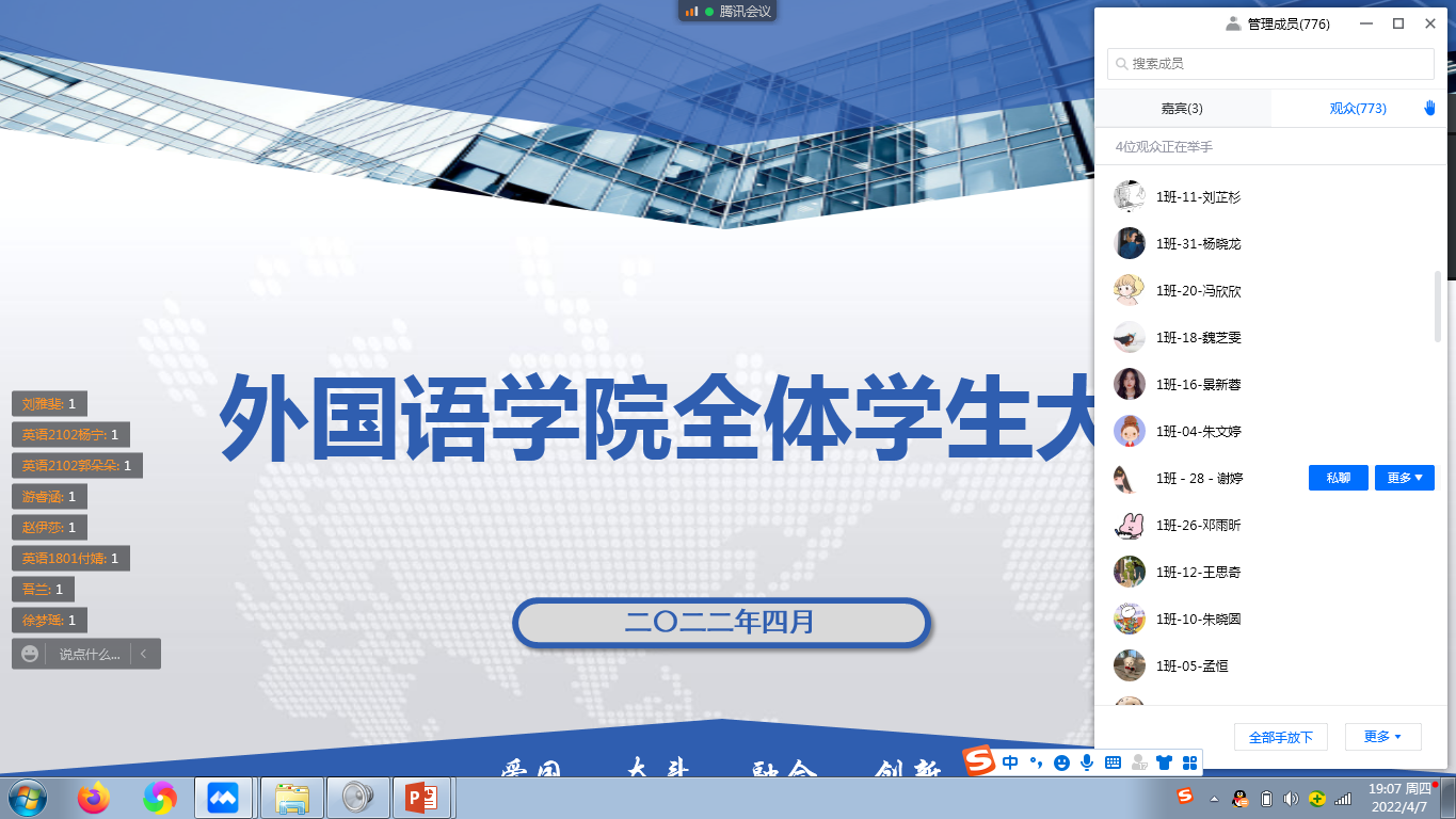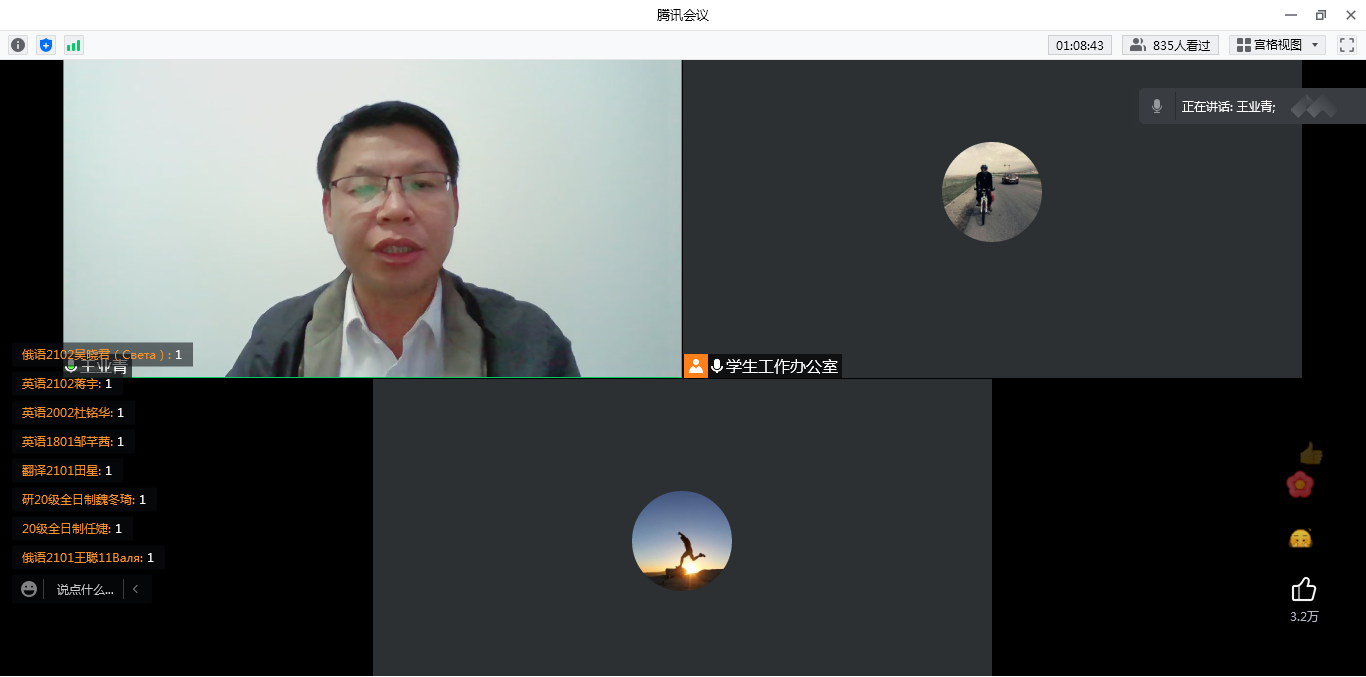 班级建设工作。4月7日晚通过召开了线上全院学生会议。院党委副书记王业青,辅导员老师,全体研究生、本科生参加会议。会议由院学生工作办公室主任周宇主持。