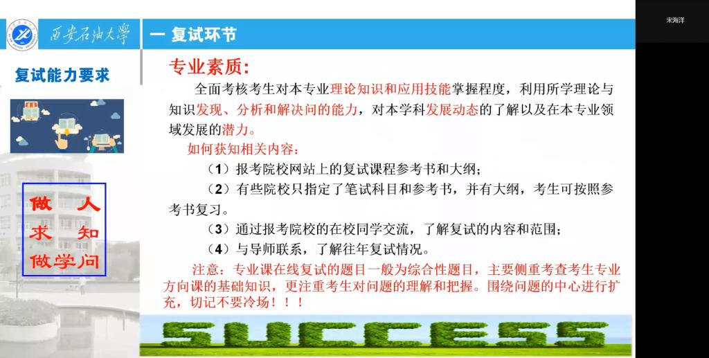 党委书记、副院长、三级教授宋海洋老师担任主讲,70余名考研上线学生参会。会议由2018级辅导员赵飞老师主持。