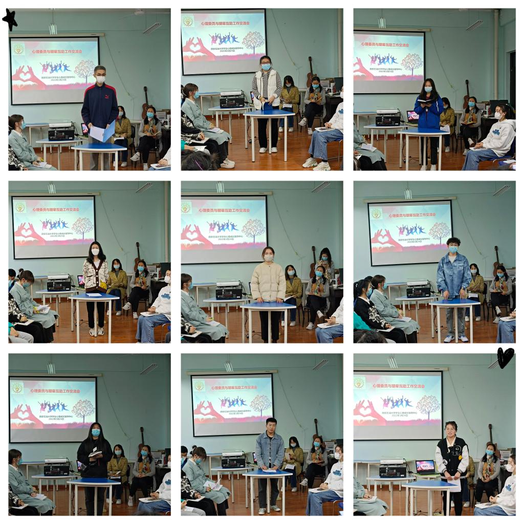 交流会上,金融2101班的心理委员袁秀琴、中文1901班的吴磊、新闻2101班的刘梦轩、石工(教改)2001班的谭钦元、土木1904班的艾曼、英语2101班的贾诗雨、商务2101班的谭华菲、储运2103班的张卓然等同学分别从班级同学的实际需求出发,尤其是疫情期间同学们出现的情绪波动、宿舍关系、情感困扰、危机事件等状况,介绍了他们开展的相关工作,列举了诸如“油缘心理每日微分享”发布、寻找生活中的小确幸、线上主题班会、宿舍抗疫视频拍摄等班级心理健康教育与朋辈互助的活动,分享了工作开展中的主动积极、敏锐观察、沟通交流、危机识别等经验,并提出了工作开展过程当中的困扰;心理委员联合协会会长、国贸2001的心理委员姚汤博同学介绍了疫情期间心理委员联会协会的工作,他说心理委员们有强烈的使命感与责任心,自发组织了心理志愿者活动,开发了“树洞”等平台,用朋辈的资源帮助求助同学,并转介有危机的同学。大学生心理协会活动负责人金材1902的 贾新碌、商务2002 李怡然同学则分享了心理协会同学们的兴趣小组学习、校园服务、疫情期间喜闻乐见的朋辈活动。