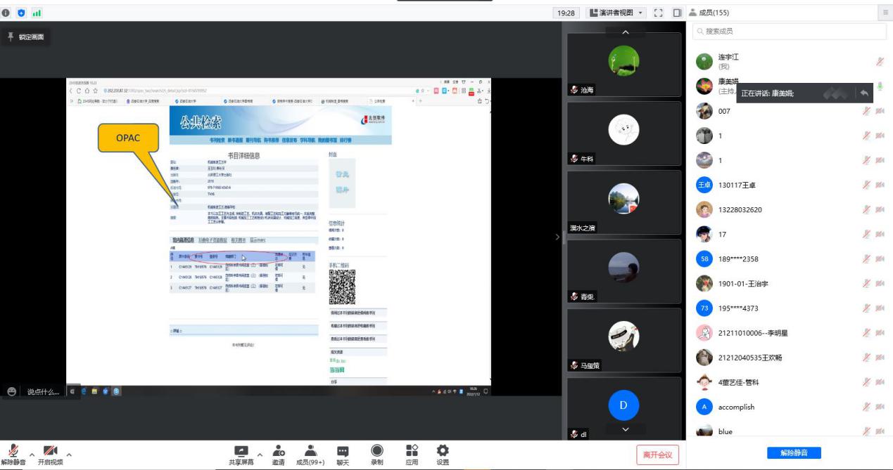 为强化学生科研能力的培养,有助于毕业生开展毕业论文写作,3月16日下午,图书馆参考咨询部康美娟老师为同学们主讲了数据库应用专题讲座。基于疫情防控考虑,此次讲座采取了线上形式,共有155名毕业生参加了讲座。