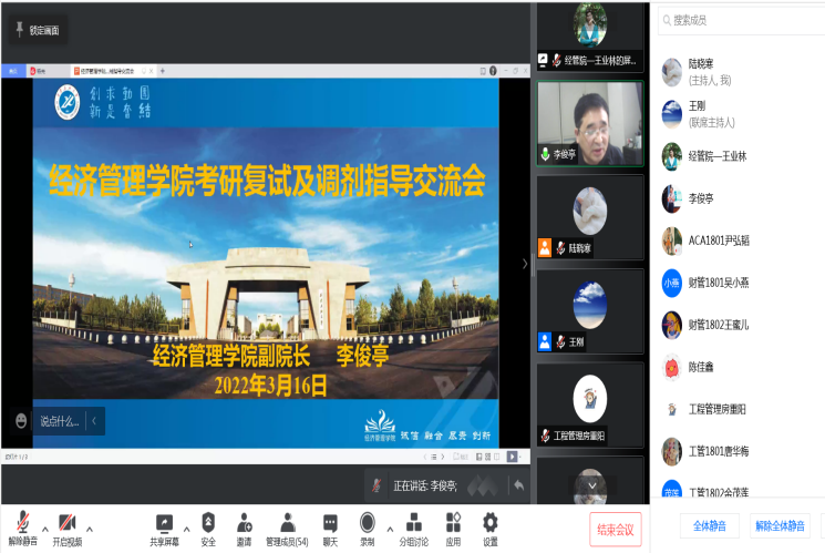 副院长李俊亭围绕考研成绩的构成、面试的注意事项、复试资料的准备等方面内容为与会学生作考研复试调剂指导并回答大家提问,他建议大家,一是要关注全国考研趋势,认真梳理和分析目标院校的复试及调剂政策,做好各种复试调剂信息的收集工作,掌握正确的调剂志愿填报方法;二是要明确目标、合理定位,多方联系、积极应对,把握好研究生复试、调剂的时间节点,增强个人自信,充分展示自我;三是因疫情原因今年复试或有调整为线上的可能,要认真准备,严肃对待,把握机会,密切关注研招网及相关院校动态,提早着手准备复试需要的各种资料,以饱满的精神状态迎接复试工作。