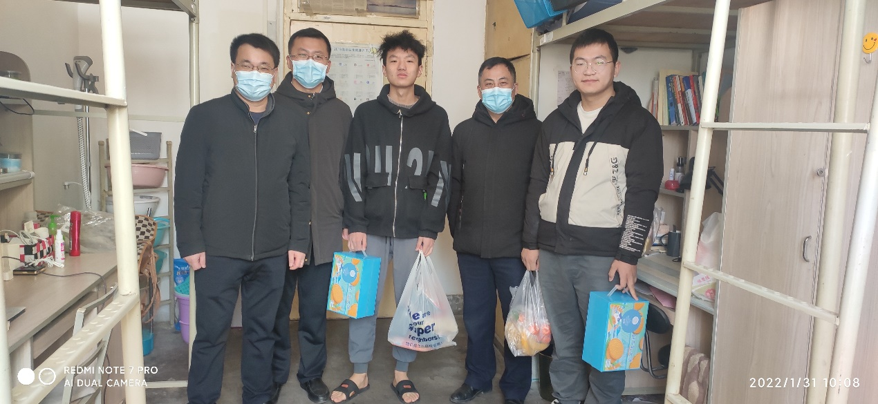 院党委书记廖敏、院长傅海威、副院长折延宏、陈国祥来到2#学生宿舍636房间,看望慰问2名春节留校学生。几位老师详细询问了2名留校学生近期的生活和学习安排,鼓励他们积极利用这段假期,锻炼身体,加强学习。老师们还重点向留校同学强调了稳定安全注意事项。