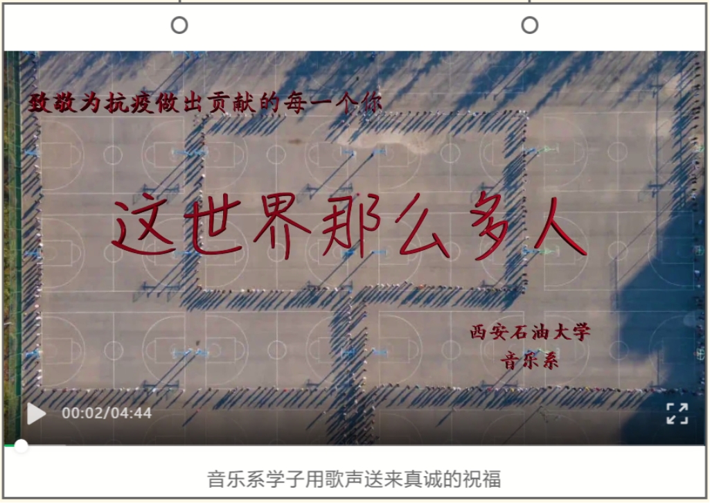 2021年末在西安疫情日趋严峻的形势下,雁塔校区师生开始了为期一个月的线上教学和封闭生活。在音乐系党政领导的倡议和组织下,我系发出了一系列抗击疫情的声音和音符,教师们积极关怀着每一位学生的学习生活,学子们日夜留守宿舍不畏枯燥,共同制作一篇篇小视频为抗击疫情贡献自己小小的力量。