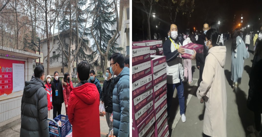 一户居家隔离的老师,他在寒风中排了3个小时的队,为居家隔离的老师购买了充足的菜品,没顾上给自己家买上一棵菜。雁塔校区的研究生经常收到导师、辅导员爱心投喂。鄠邑校区长期坚守的老师们顾不上自己吃饭,组织大家有序检测核酸、分发爱心捐赠和防疫物资。他们还组织本科生开展了宿舍清洁小技能比赛。郭文阁教授为全院研究生做题为“如何撰写学位论文”的线上学术报告。雁塔校区研究生辅导员人手紧缺,冯德全老师、张旋老师二话不说,第一批参加了研工部安排的教师值班;发放物资运输工具短缺,丁继军老师直接把自己家的私家车作为运输工具为大家运输物资,家里有孩子有老人的多位老师安排好老人孩子,上完网课就直接投入志愿服务当中……。据不完全统计,仅雁塔校区就有32位在校党员教师主动请缨,参加了核酸检测、物资发放、药品购买、宿舍值班等志愿服务。在校的所有教工支部书记带头参加了多项志愿服务。