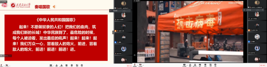 在慷慨嘹亮的国歌、团歌声中,与会师生通过观看视频的方式,体会着不畏艰难、勇往直前的抗疫画面,大家一起致敬抗疫一线工作者的辛苦付出。疫情突来,三秦遭难,章芯蕊、李旻彤、王镘婷三位同学分享抗疫故事,让与会全体师生记住了舍小家为大家坚守奋斗一线的辅警周刚和蒸出一千多个馒头的“西安好人”张花等抗疫模范。