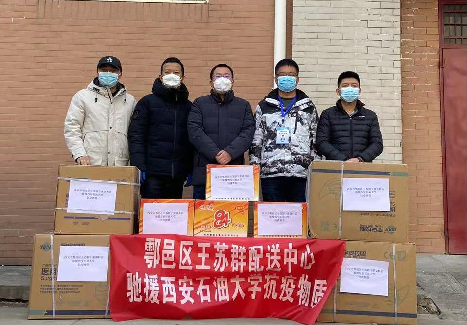 食材供应商鄠邑区王苏群干菜调料店赠送了普通医用口罩12000个,N95口罩600个,84消毒液10箱。