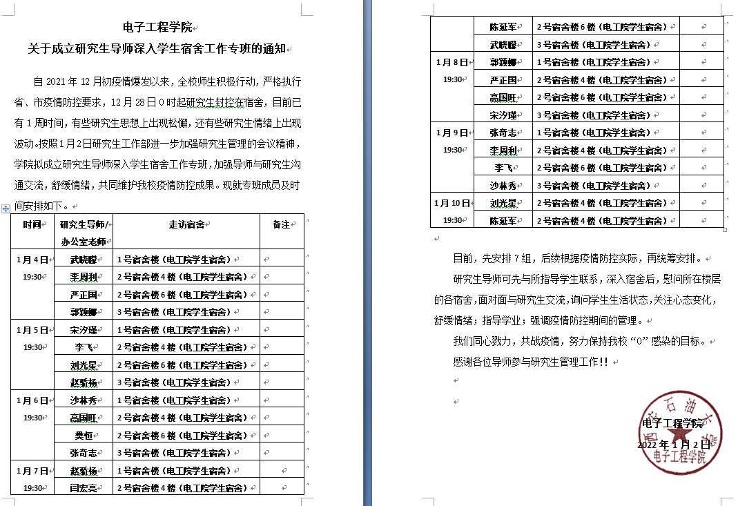 决定成立研究生导师深入学生宿舍工作专班,研究生导师们报名踊跃。1月4日开始,每天有导师走进学生宿舍,面对面与学生交流,及时了解研究生遇到的问题和困难,指导学业,鼓励研究生积极面对疫情,树立信心,共同努力,坚决打赢这场疫情防控歼灭战。目前,德州扑克