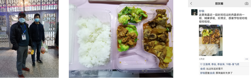 为被隔离的130名研究生购买盒饭,为他们送上可口暖心的饭菜,鼓舞学生们坚定信心,克服困难,同心抗疫。