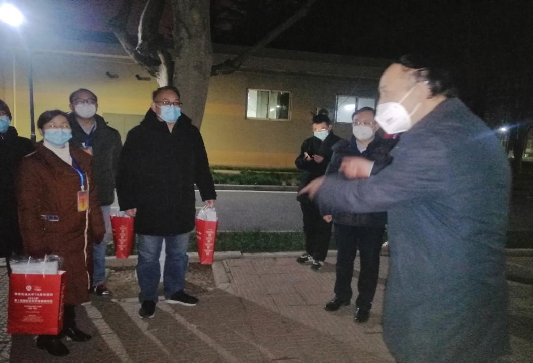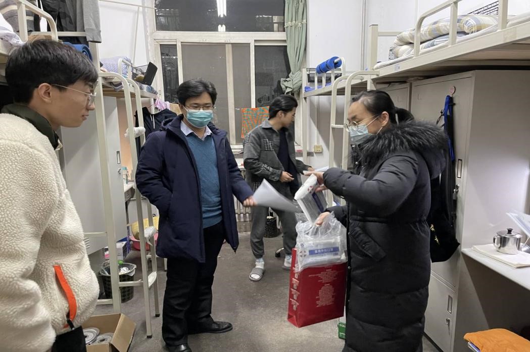 党员先锋队老师们分三组到雁塔校区1、2、3号楼看望研究生并发放防疫口罩。