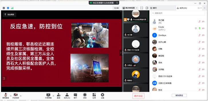 疫情防控工作部署,全院上下团结一心、众志成城,研究生各党支部、学生党员及班团干部积极发挥战斗堡垒和先锋模范作用,组织同学按时高效完成了多轮次全员核酸检测。经过精心准备,马院研2101班党支部和班委会为宣传疫情防控知识,丰富同学们的学习生活,增强同学们抗击疫情的决心和信心,组织召开了“抗击疫情 我们在行动”主题线上交流活动。