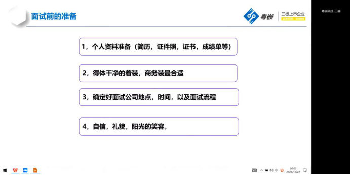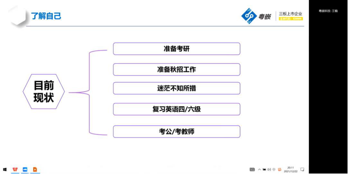 2021年大学生创新创业训练营第十讲顺利开课。本次课程的主题是《互联网职业规划及就业创业分享》,由广州粤嵌通信科技股份有限共公司西安分公司校企合作总监、大数据高级工程师王楠老师主讲,训练营全体学员参加了学习。
