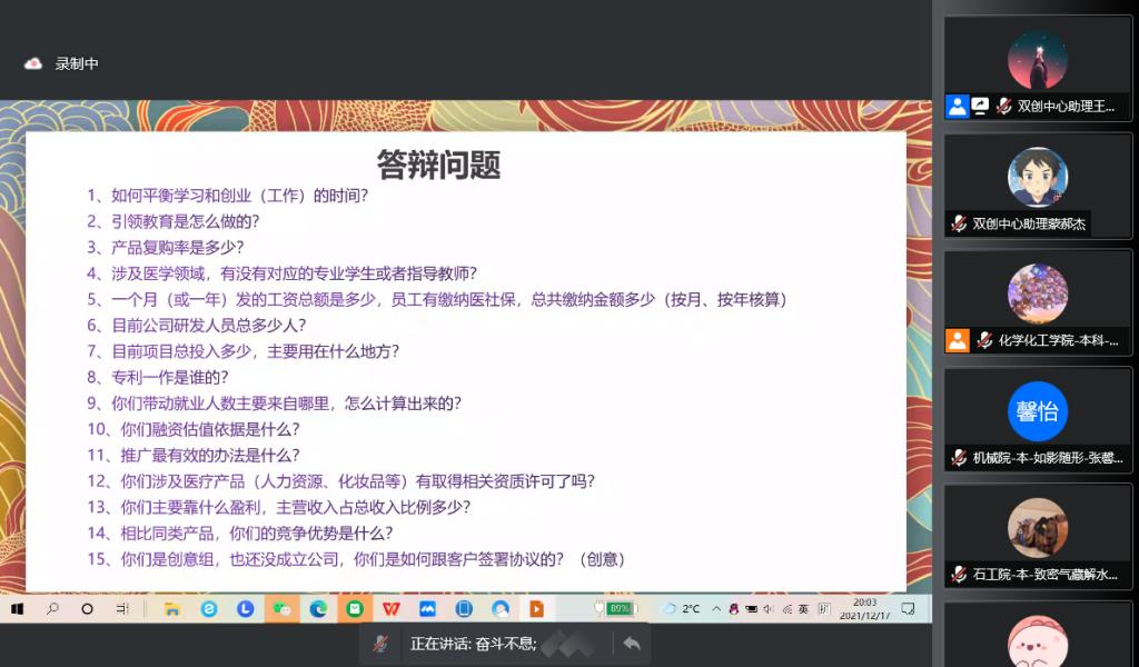 针对“如何准备路演答辩PPT”的内容,刘老师强调,在准备阶段先做出项目的商业计划书,再做好“减法”,浓缩项目精华,从而使路演PPT简洁、清晰,突出项目优势及亮点。之后,刘老师总结了大赛路演环节选手“易错题”集锦,对答辩时评委关注的热门问题进行总结,并向学员们逐一讲授应对策略。在课程最后,刘老师悉心解答了学员们在课程学习当中的疑问。