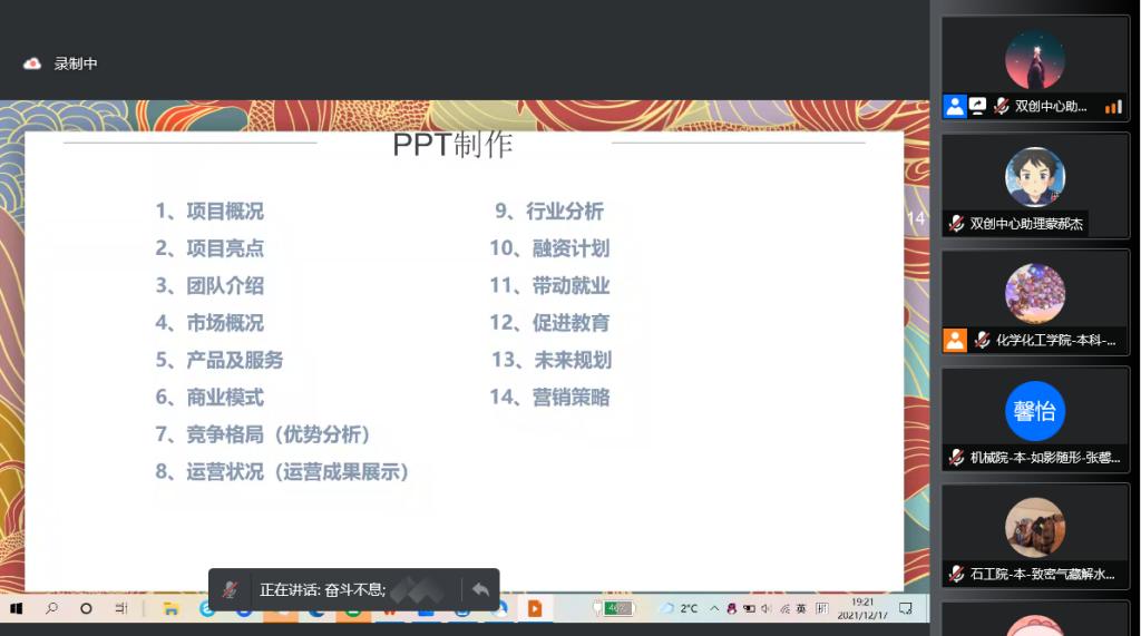 2021年大学生创新创业训练营第八讲顺利开课。本次课程以《路演技巧和流程》为主题,训练营全体学员参加了本期课程。
