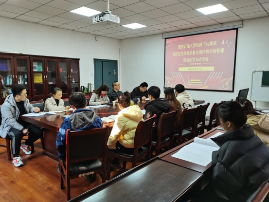 研究生党员素质量化测评积分制管理实施办法(试行)》,并就该办法及指标体系从指导思想、组织保障、测评内容、操作流程等方面汇报,就动力(思政素质)、活力(模范带头)、潜力(学习情况)、压力(纪律规矩)、魅力(先锋示范)“五力”指标体系进行了重点介绍。