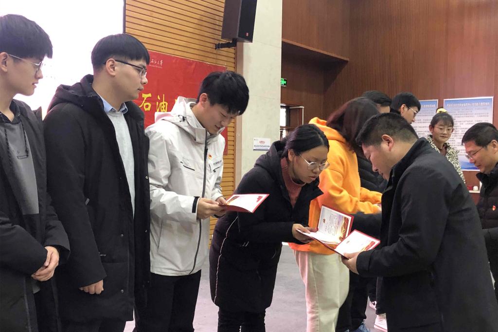 活动最后,马勇老师和朱战威老师为大家分切蛋糕,向转正党员代表发放“政治生日”贺卡并合影留念,全体预备党员代表集体参观了参观铁人纪念馆,进行了集体入党宣誓。