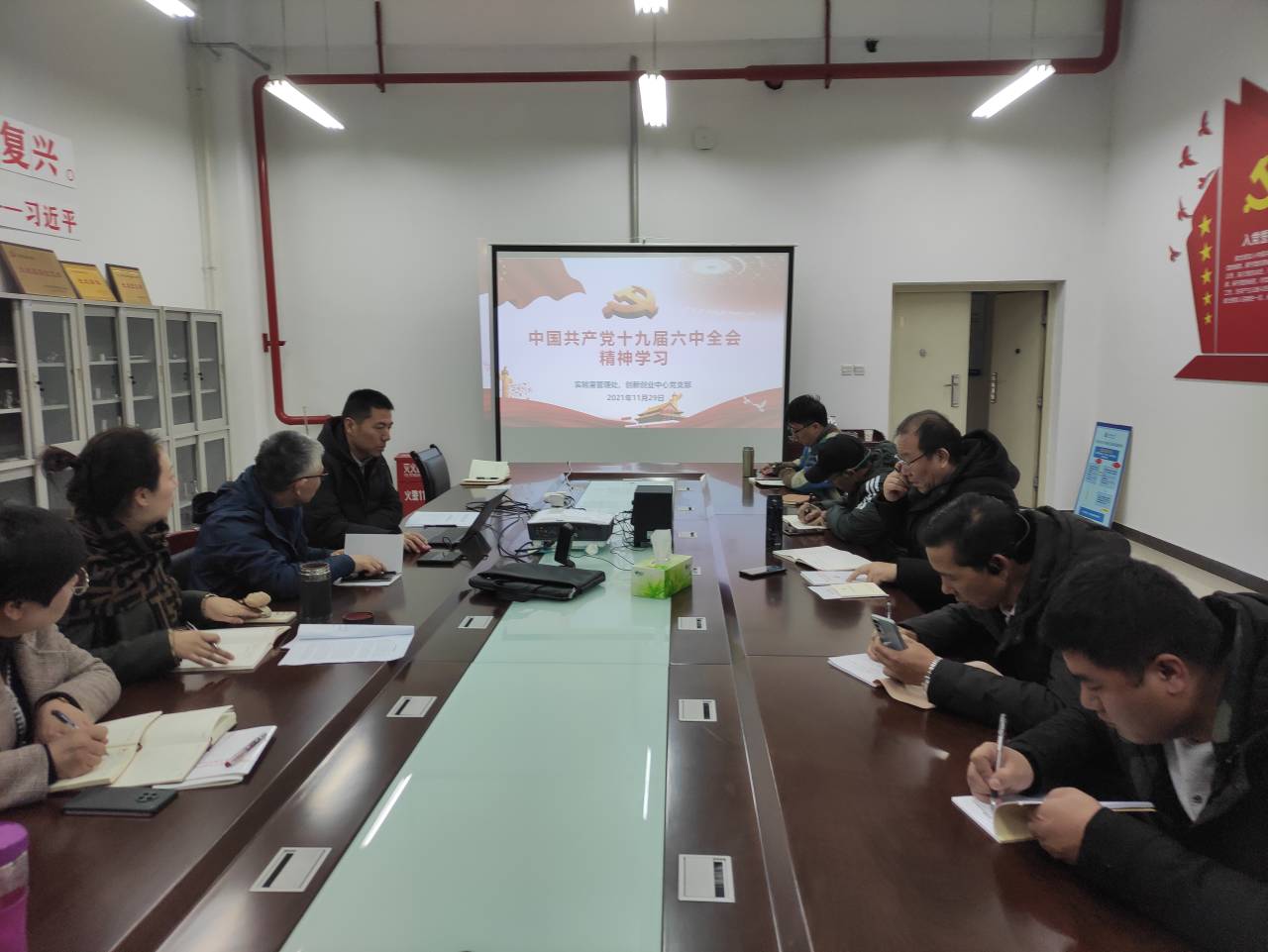 11月29日上午,实验室管理处、创新创业中心党支部在工程训练中心106会议室组织全体党员集中学习党的十九届六中全会精神。