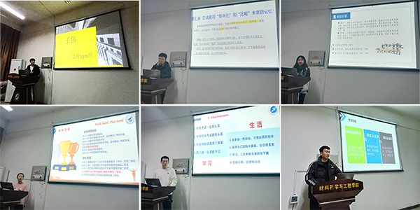 材物1901班陈潇潇从学习时间安排、不同时间段的学习计划等方面,介绍了高效学习方法,并向所有班委同学传授了兼顾学习和班级管理工作的宝贵经验,为班委明确学习和工作目标,树立了良好的榜样。材物1801班李思澜现已保研成功,她以自己的亲身经历为能材21级学生介绍了考研和保研的经验,并强调大学学习中积极参加竞赛和科研项目的重要性。材物1801班胡腾介绍了自己的学习经历,提醒同学们要珍惜时间,把握当下,强化自我管理能力,为自己的梦想去拼搏。