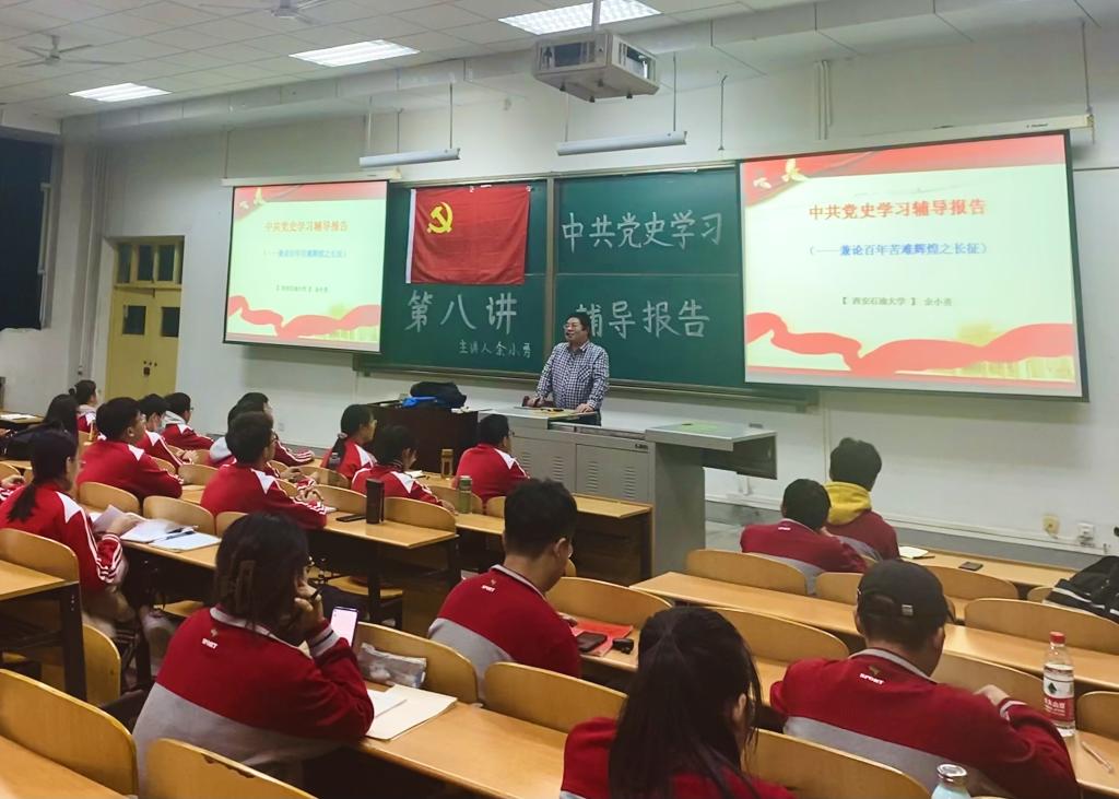 课堂上,余书记首先通过对新民主主义革命阶段,社会主义革命和建设阶段,改革开放和社会主义现代化建设阶段,中国特色社会主义新时代这四个阶段的讲解,帮助同学们理清了中国共产党的历史发展脉络,进一步了解党的不懈奋斗史、党的理论探索史和党的自建史。其次,余书记向同学们详细解读了学习党史的意义,阐述了学习党史的重要性。最后,余老师向同学们推荐了金一南教授的著作《苦难辉煌》,帮助同学铭记历史,鉴往知来。