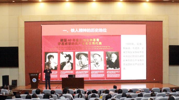 郭岗彦主任以新中国石油工业发展史为背景,从铁人精神的历史地位、铁人精神产生的时代背景、铁人王进喜以及解析铁人精神密码四个方面展开讲述。通过系统阐述铁人精神产生过程、丰富内涵、历史地位、时代价值,指出铁人精神已融入中华民族精神,是大庆精神典型化、人格化的浓缩。讲座通过大量历史照片和视频,生动讲述王进喜的成长故事,形象再现了老一辈石油人为摆脱国家贫油落后的帽子,战天斗地、勇于奉献的家国情怀,深刻阐释了“铁人”王进喜“为国分忧、为民族争气”的爱国主义精神、“宁可少活20年,拼命也要拿下大油田”的忘我拼搏精神、“有条件要上,没有条件创造条件也要上”的艰苦奋斗精神、“为革命练一身硬功夫、真本事”的科学求实精神和“甘愿为党和人民当一辈子老黄牛”的无私奉献精神。郭主任还解析了铁人精神的密码,即感恩是铁人精神的核心密码,一根筋是铁人精神的前进密码,用心是铁人精神的成功密码,谦虚是铁人精神永葆初心的保鲜密码,并重点对铁人精神密码的集中体现“五讲”进行了深刻解读。