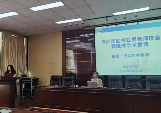 组织了系列学术讲座活动,特邀请前外交部翻译室主任徐亚男老师于6月25日上午在雁塔校区第五会议室举办题为“浅谈外事翻译”的专题报告会。院长于艳英、副院长刘辉、陈武及全体师生参加了讲座,讲座由刘辉副院长主持。