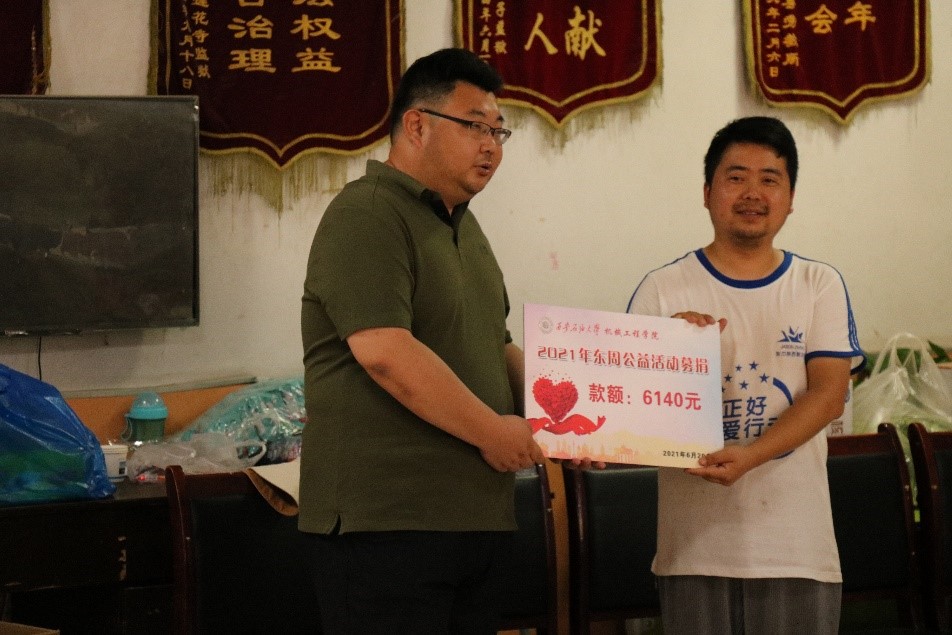 将前期一周募捐的善款6140元悉数赠予儿童村,并为孩子们送上了募捐的衣物、书籍和购买的肉、蛋、奶、蔬菜、水果,表达了师生们的良好祝愿。随后,团委书记文爱国老师对此次主题实践活动做了讲话,他强调:今年是中国共产党建党100周年,在风雨百年的进程中,党始终为了广大人民群众的根本利益而奋斗,正因为有党的领导与关怀,儿童村的孩子们才有了温暖的生活环境,他勉励儿童村的孩子们一定要听党话、感党恩、跟党走,健康成长,努力成才,回报社会;希望党员同学们传承好二十四年前机械学子公益活动的初心,敢于担当,勇于作为,跑好“大手拉小手,爱心暖东周”的接力赛,风雨无阻,矢志不渝,坚持为儿童村的孩子们送去精神上的支持、生活上的补给、学习上的提升,让纯真的“伙伴关系”永续,让纯洁的爱心薪火相传。