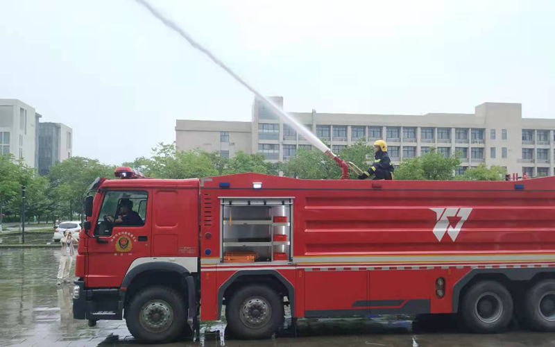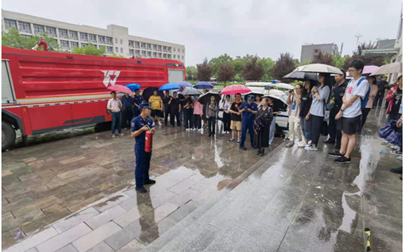 本次活动分为安全知识宣讲和灭火培训体验两部分。保卫处积极协调鄠邑区应急消防大队,邀请鄠邑消防大队丰京路消防救援站李哲讲解了应急避险方式,自救互救方法以及应急救援工作内容,现场展示了单人消防装备。灭火培训体验部分,消防队员带参与者现场零距离了解了消防车构造及功能,并进行了消防车水炮喷射演示,讲解了灭火器使用方法,并现场与同学们互动答疑。