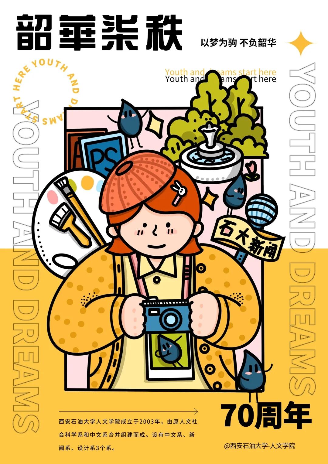 卡通形象手拿相机,后附调色盘与话筒,生动活泼地表现出了人文院学生浓厚的人文艺术气息。