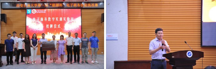 比赛过程中,还举行了“电子商务教学实训实验室”授牌仪式,王君萍院长向电子商务专业负责人赵需要老师授牌。赵需要老师分享了自己举办此次竞赛的初衷和举办过程中的心路历程,他希望同学们能通过本项赛事实现理论与实践的完美结合,将知识融会贯通,总结学习成功经验,学会创新突破,并以乔布斯的名言“Stay hungry, Stay foolish”鼓励大家在积极学习知识、脚踏实地实践中前行。