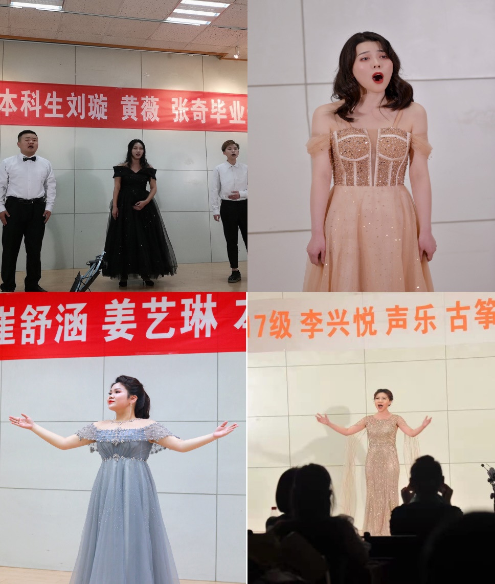每场音乐会都是精彩纷呈,以丰富多彩的形式展现了音乐系声乐专业教学成果。其中,田立老师指挥的女生小合唱《灯火里的中国》,杨美萍老师指挥的《老师,我想你》,陈俊凤老师指导的《中国歌剧》选段三重唱,让单一化的声乐演唱形式变得异彩纷呈。毕业生李兴悦,集声乐、古筝及二胡多专业并修,展示出音乐系对学生“一专多能”的培养特点。